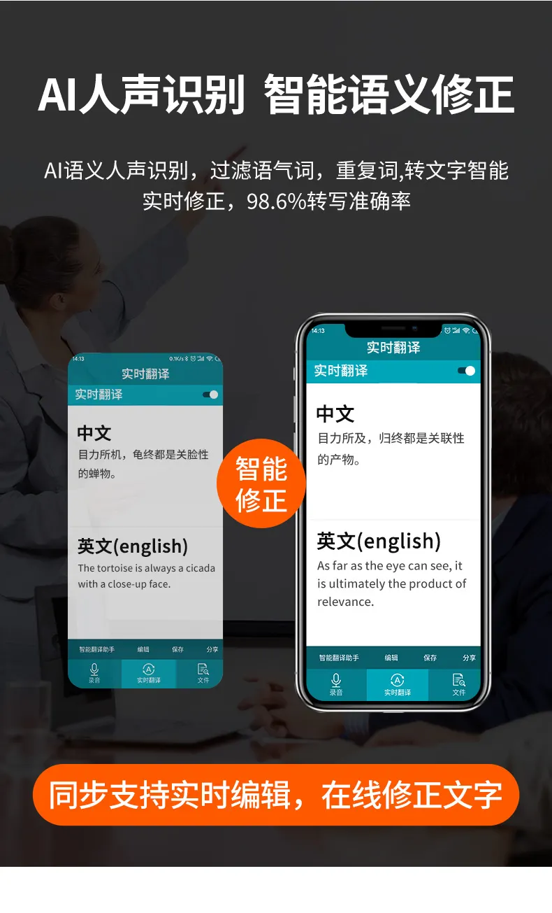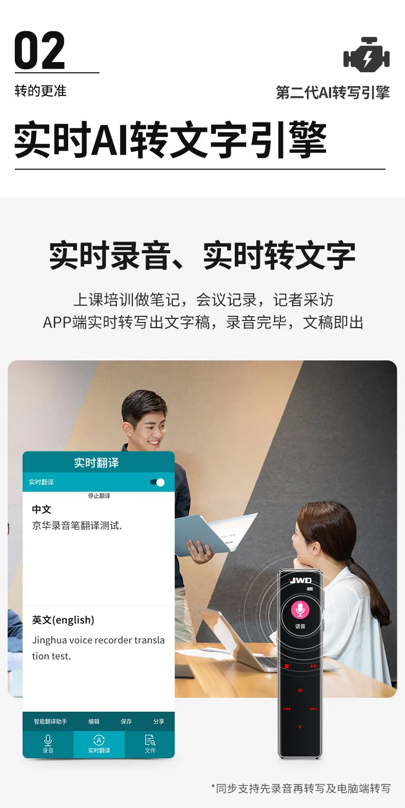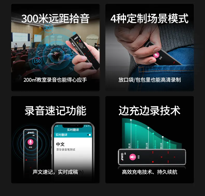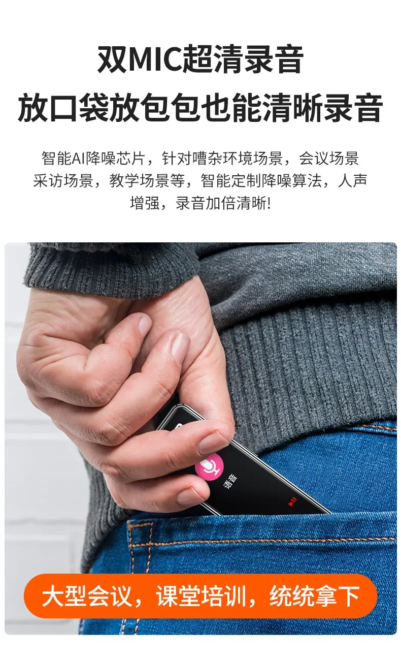 高清原聲音質,AI降噪體驗,拾音速記轉寫,25國同聲轉譯,支持邊充邊錄