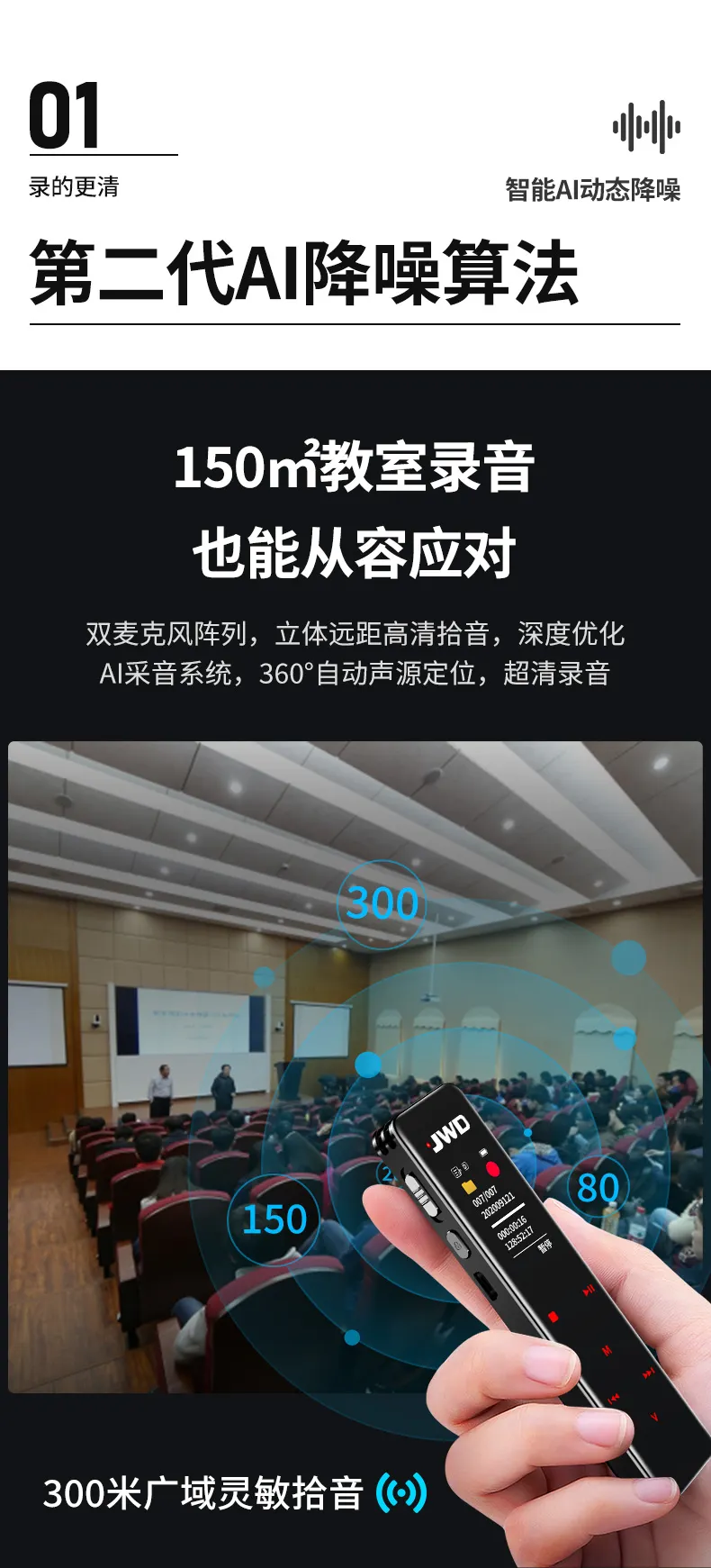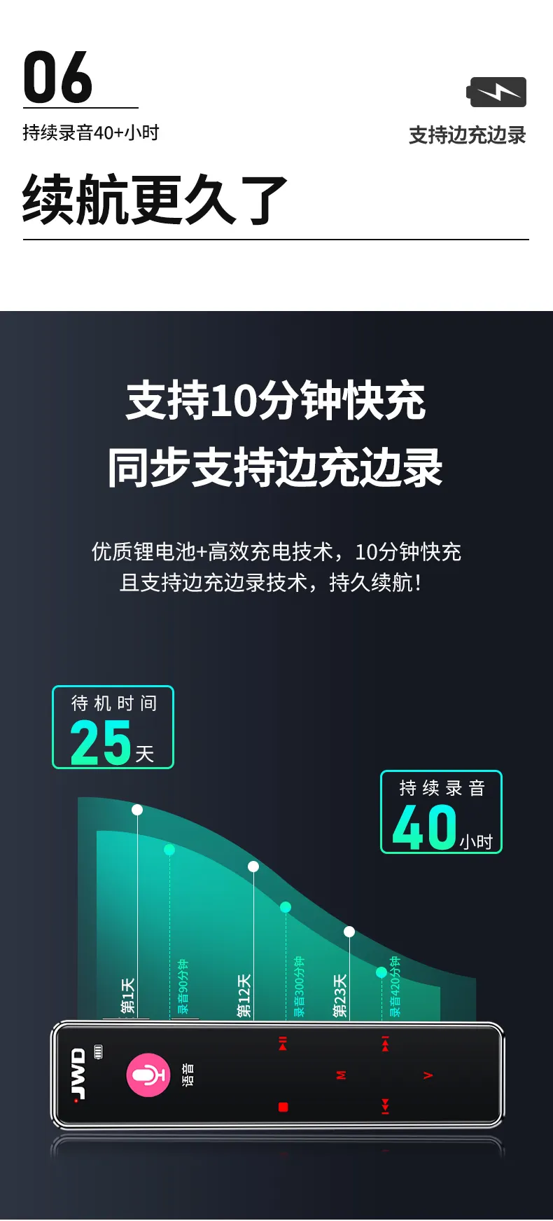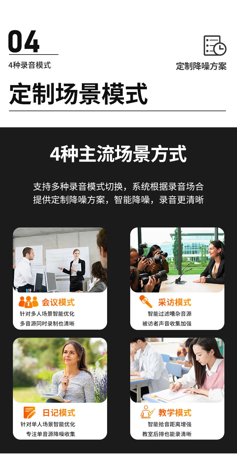高清原聲音質,AI降噪體驗,拾音速記轉寫,25國同聲轉譯,支持邊充邊錄