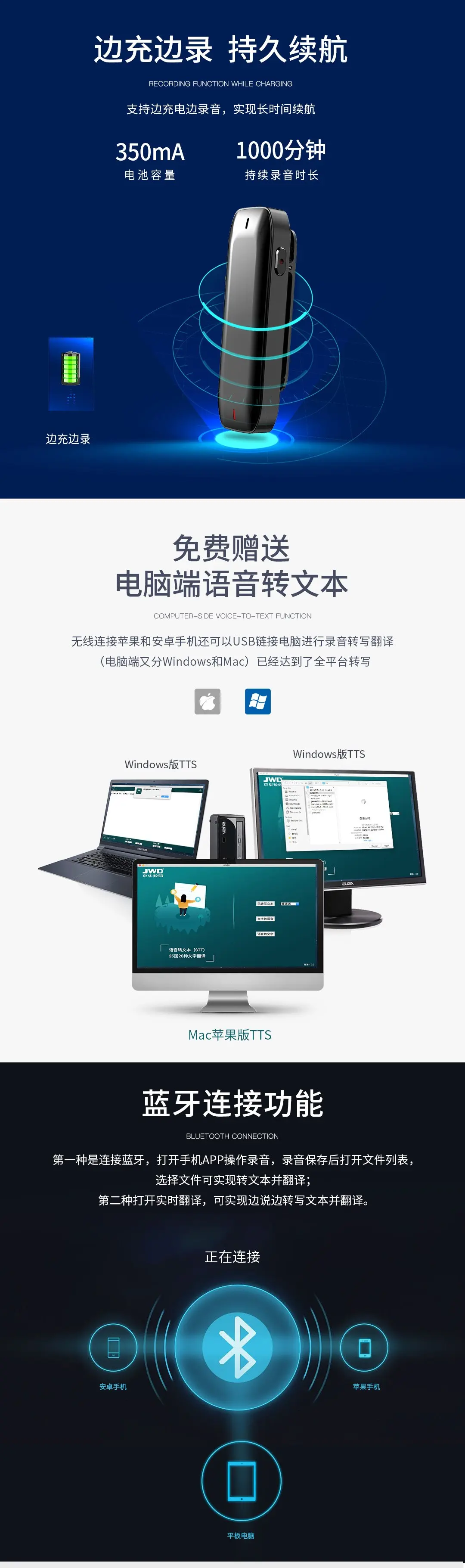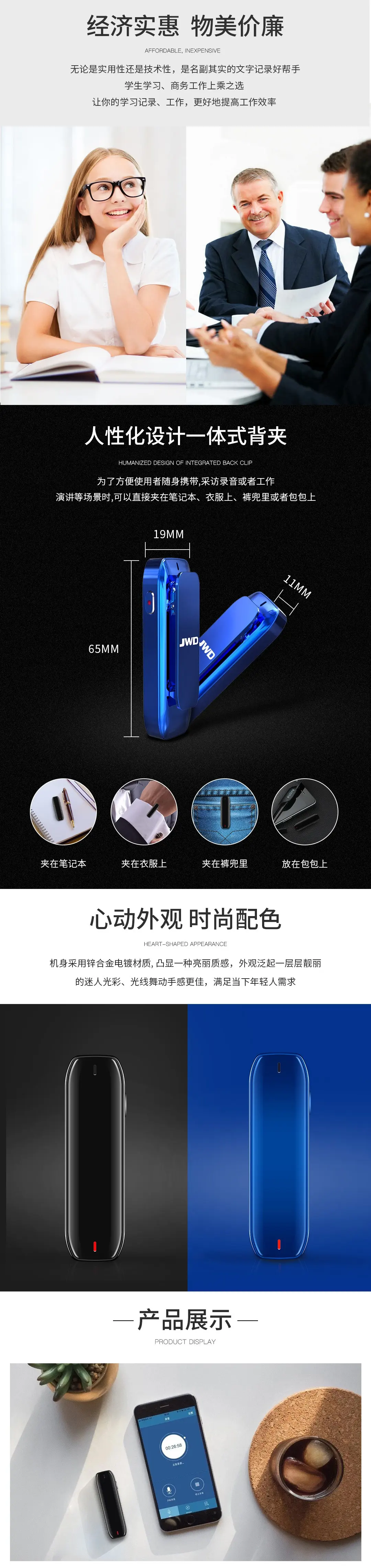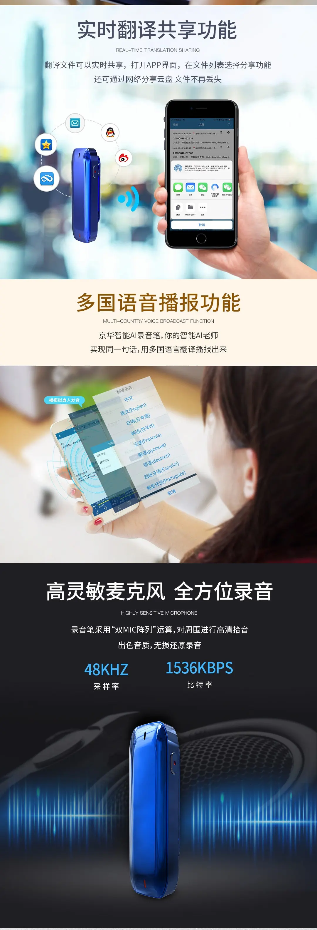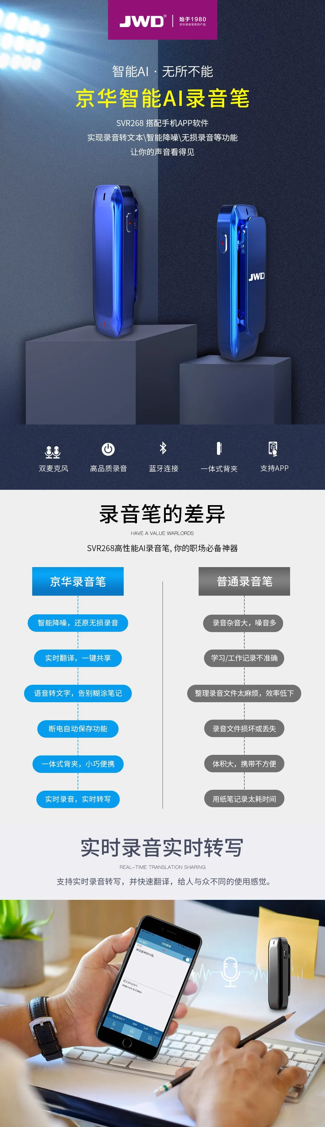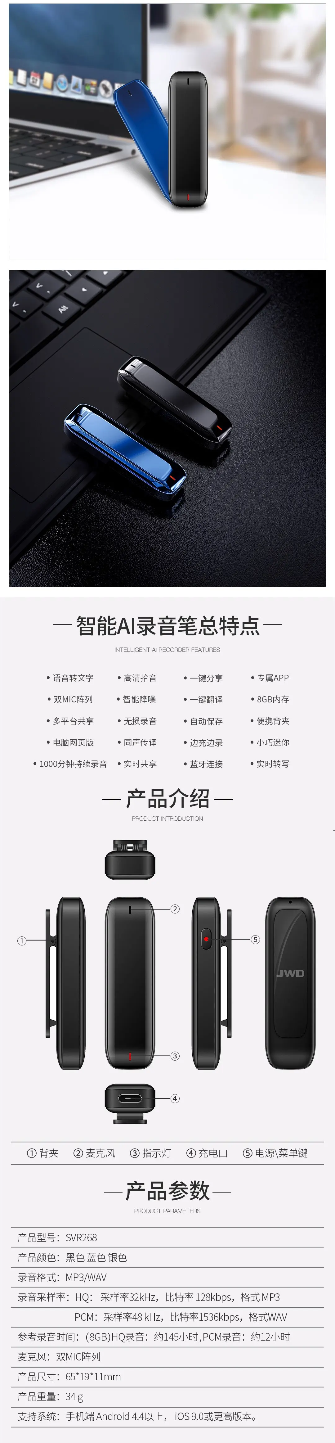 智能APP轉寫轉譯,智能降噪無損錄音,雙麥克風陣列,支持多平臺共享