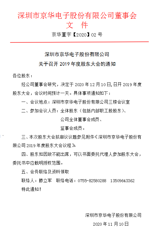 深圳市京華電子股份有限公司關于召開2019年度股東大會的通知