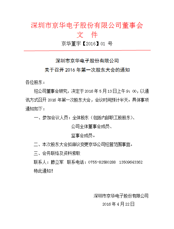深圳市京華電子股份有限公司關(guān)于召開2016年第一次股東大會的通知