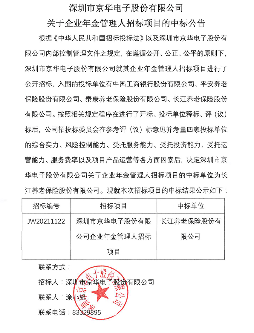 深圳市京華電子股份有限公司企業年金基金管理人招標公告