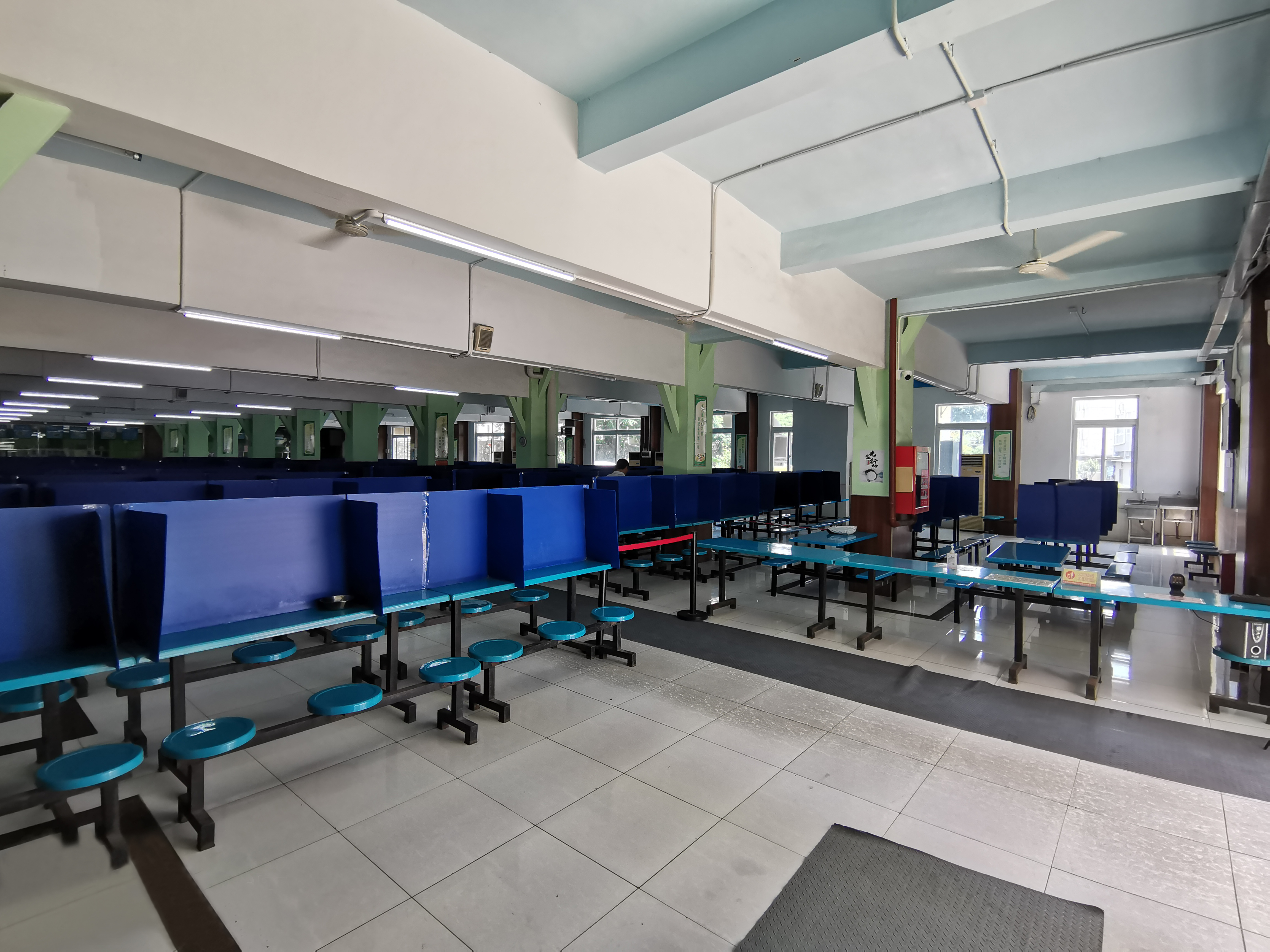 食堂的每張餐桌設置了隔離板,減少感染風險。