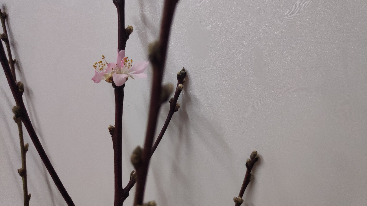 疫情“寒冬”之下,桌上的桃枝是離我最近的春色,兩朵粉白的小花顫顫巍巍立在枝頭,倒也烘托出一些春天的氛圍。期盼疫情的“凄風冷雨”快些消亡,抗疫的暖春快些到來。