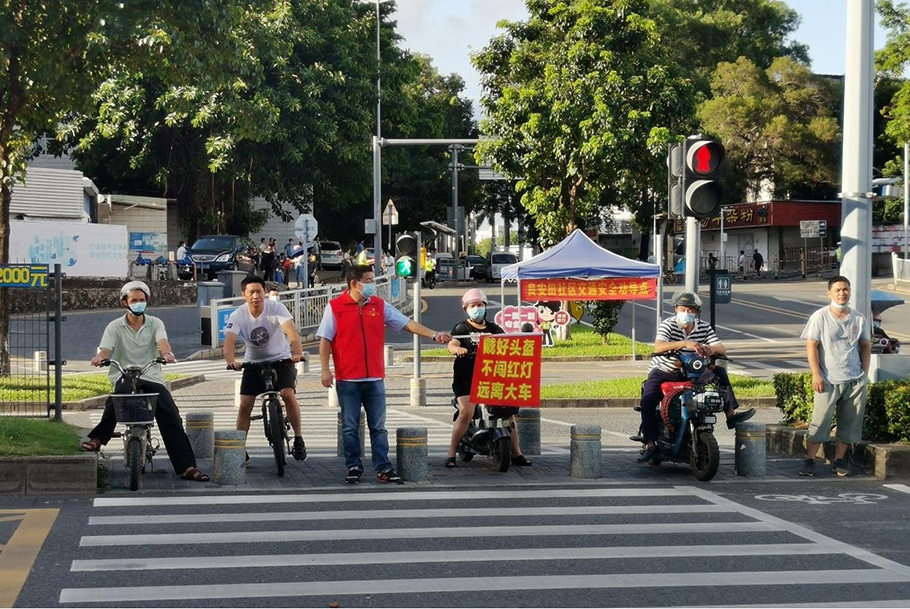另外,為豐富支部黨日活動,龍崗京華黨支部全體黨員參加良安田社區組織的“交通安全勸導”工作,在下班高鋒期(下午5:00-7:00)分組到道路交通繁忙的十字路口值勤,勸導未佩戴安全頭盔的電動車駕駛人戴上頭盔,阻止行人闖紅燈、電單車和機動車搶道等不遵守交通規則的行為。黨員志愿者頭頂高溫酷暑,堅守在各個點位,耐心提醒行人遵守交通規則,用心用情為社區群眾撐起交通出行的“安全傘”。